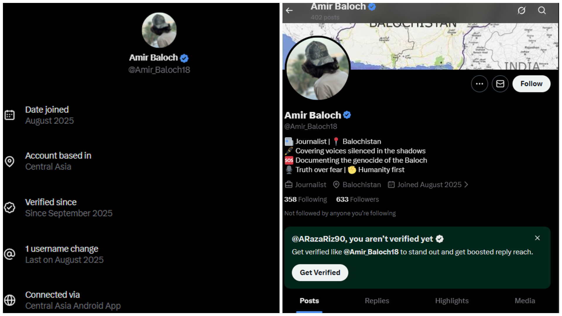 Another is @Amir_Baloch18, whose bio lists “Balochistan” as the location, yet X marks the account as being based in Central Asia, with an additional VPN warning.