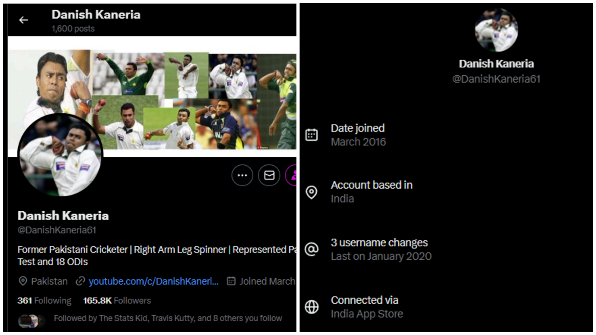 In a surprising development, the profile of former Pakistan cricketer Danish Kaneria, with over 165,000 followers, is also showing up as being operated from India, according to the platform’s location exposure.
